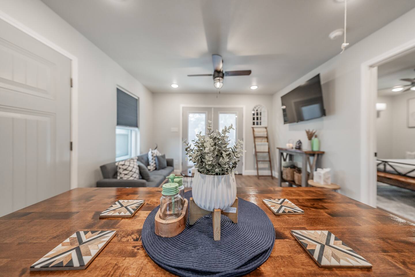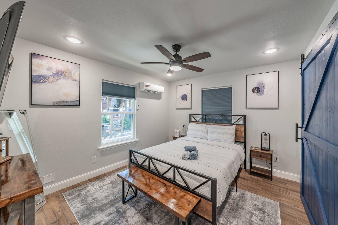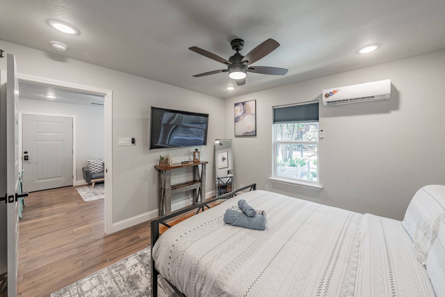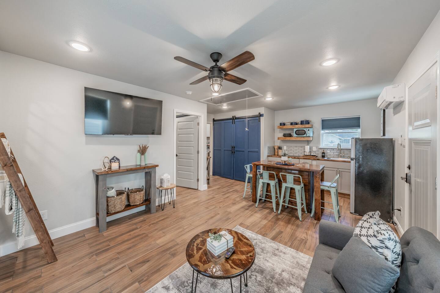 Built in blue tooth speaker in the bathroom. Cordless charging ports located in living room and bedroom. The house can comfortably host 2 guests. Only 1 car allowed for our guests.