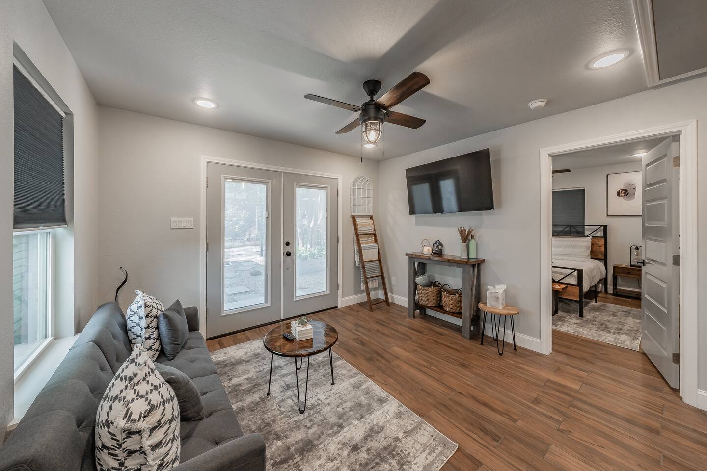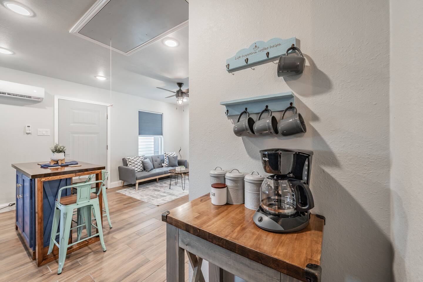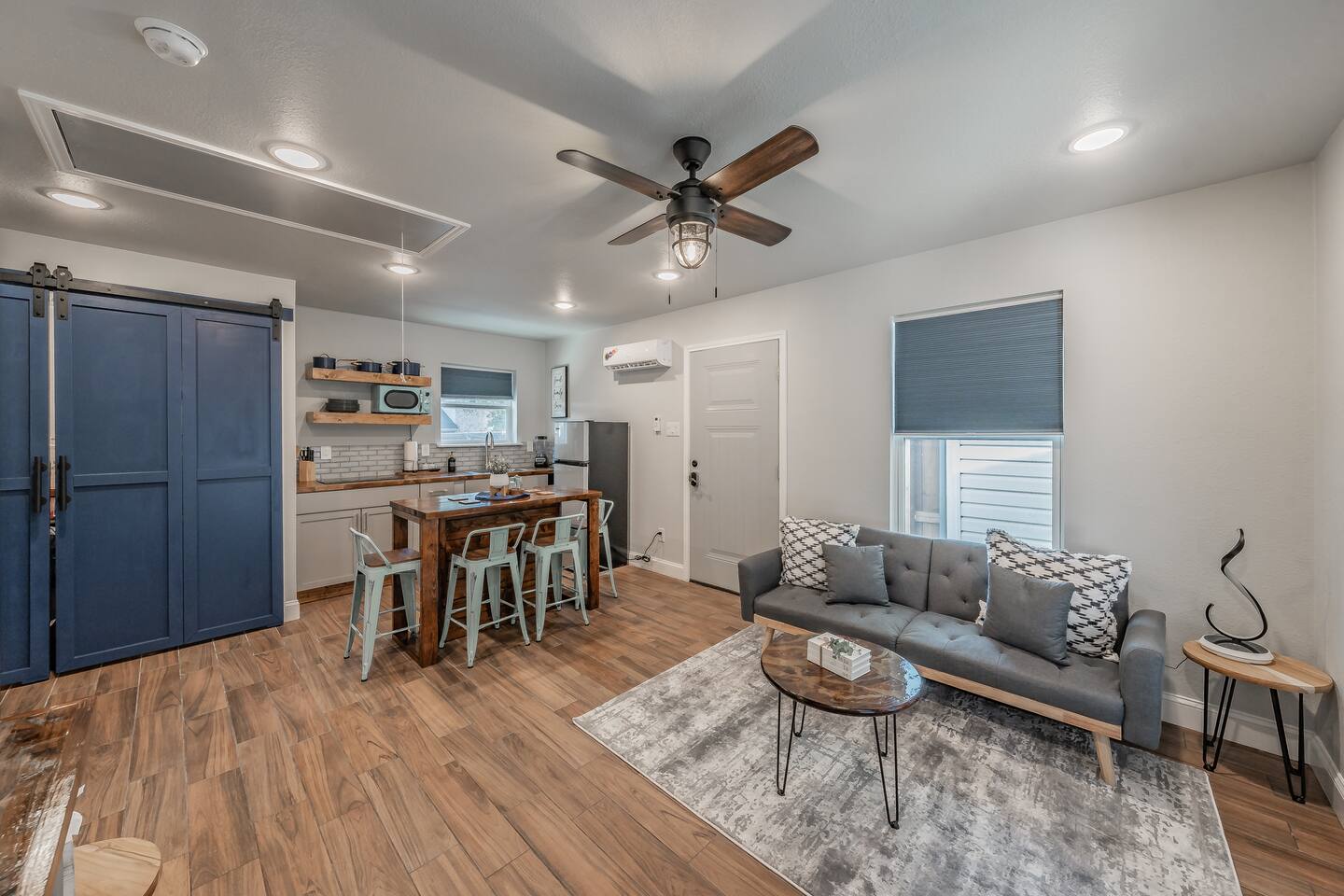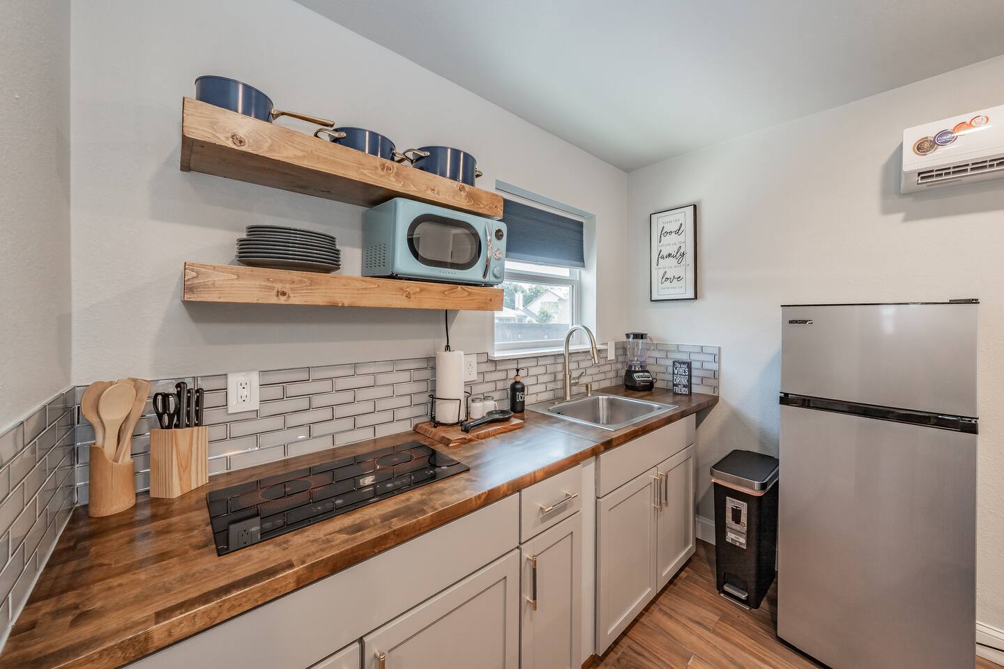 The guest house has everything you need for a comfortable stay. The bedroom includes a queen-size bed with ample closet space and a smart TV. The living room has a large smart TV. Extra single bed available upon request. The open kitchen space is equipped with all the essentials you need for your stay including a fridge, microwave, an electric stovetop and a coffee maker. Yes, we do include the coffee and sugar! Set your laptop up on the large dining table and connect to our fast wifi. The bathroom includes a walk in shower with sliding glass doors. Washer and dryer is included with your stay. Enjoy the views of the backyard with your own private patio. High speed internet included!