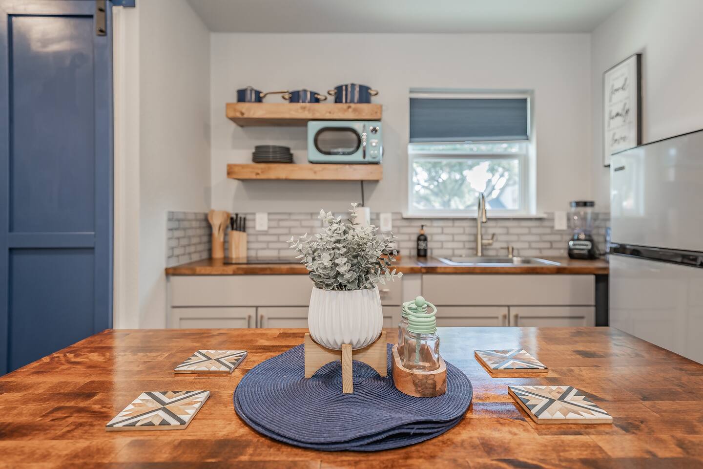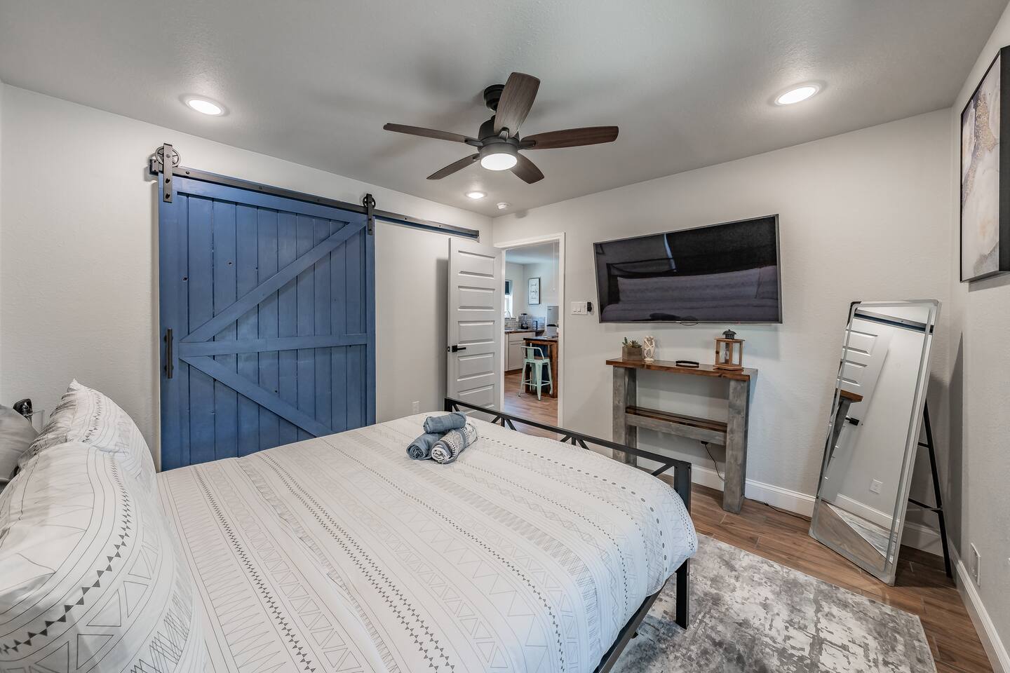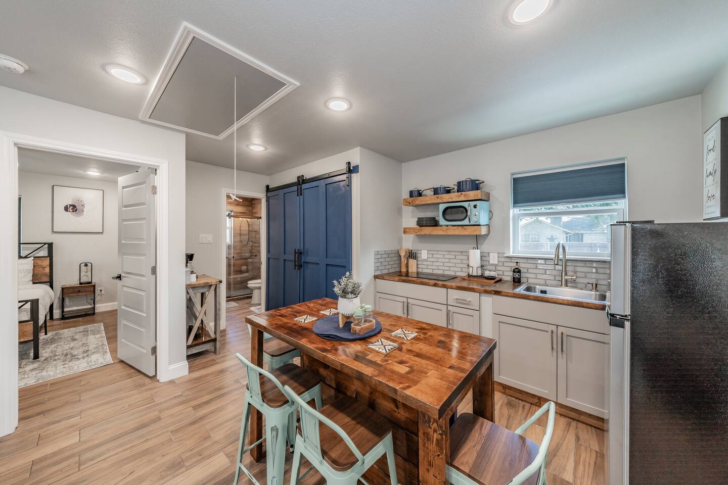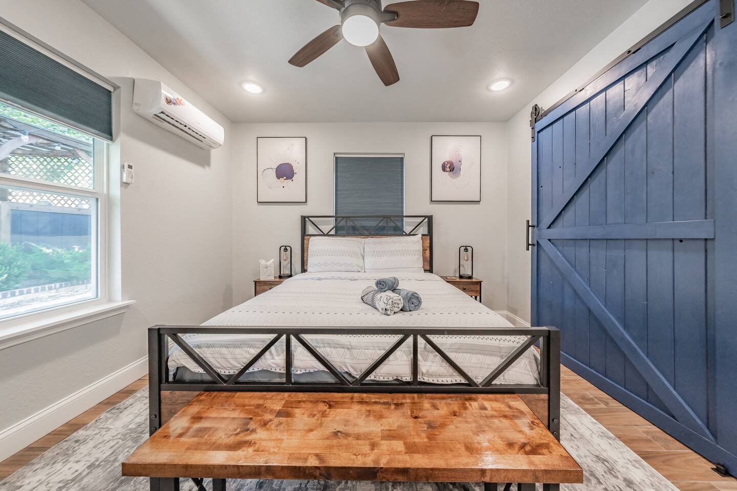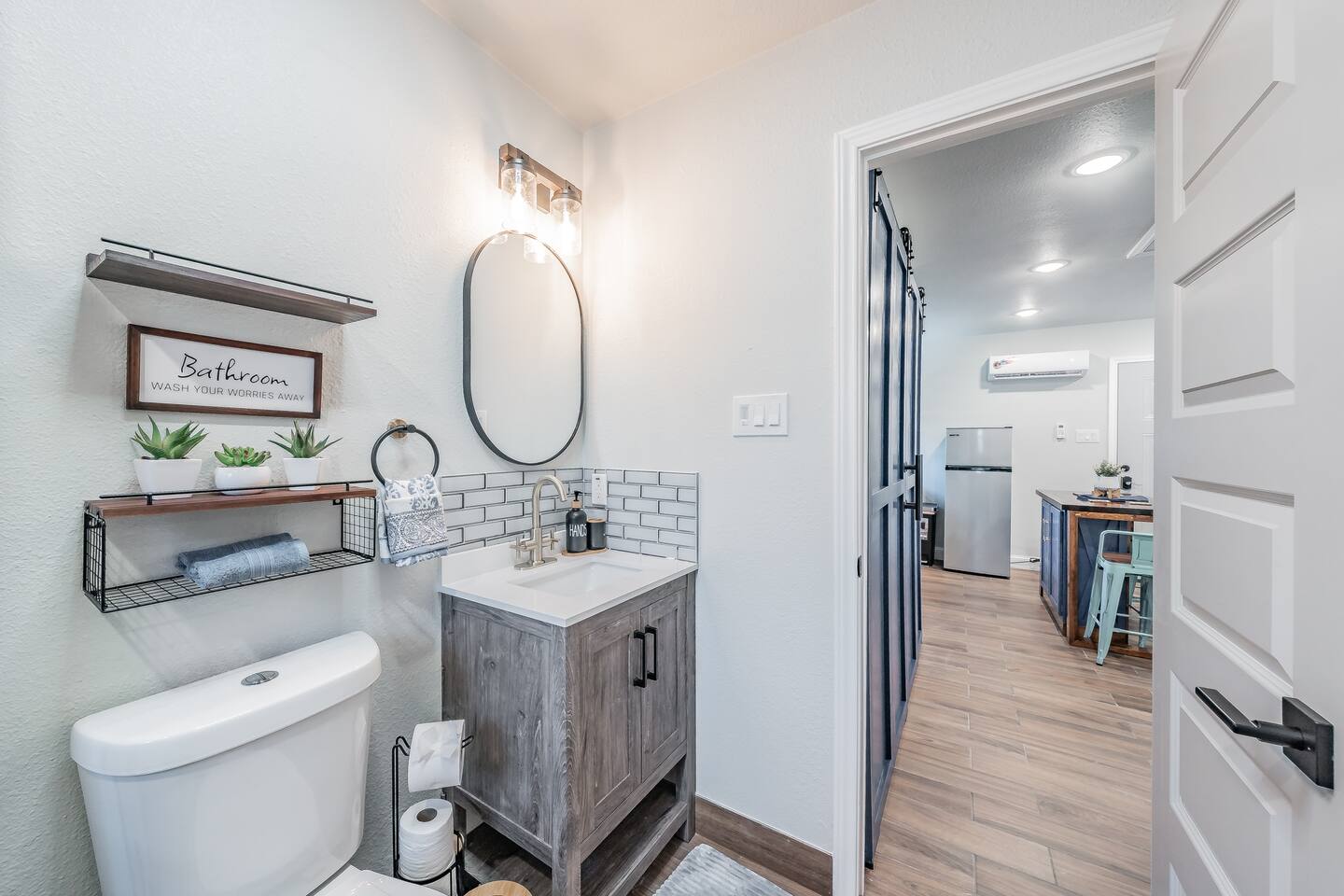 The guest house has everything you need for a comfortable stay. The bedroom includes a queen-size bed with ample closet space and a smart TV. The living room has a large smart TV. Extra single bed available upon request. The open kitchen space is equipped with all the essentials you need for your stay including a fridge, microwave, an electric stovetop and a coffee maker. Yes, we do include the coffee and sugar! Set your laptop up on the large dining table and connect to our fast wifi. The bathroom includes a walk in shower with sliding glass doors. Washer and dryer is included with your stay. Enjoy the views of the backyard with your own private patio. High speed internet included!
