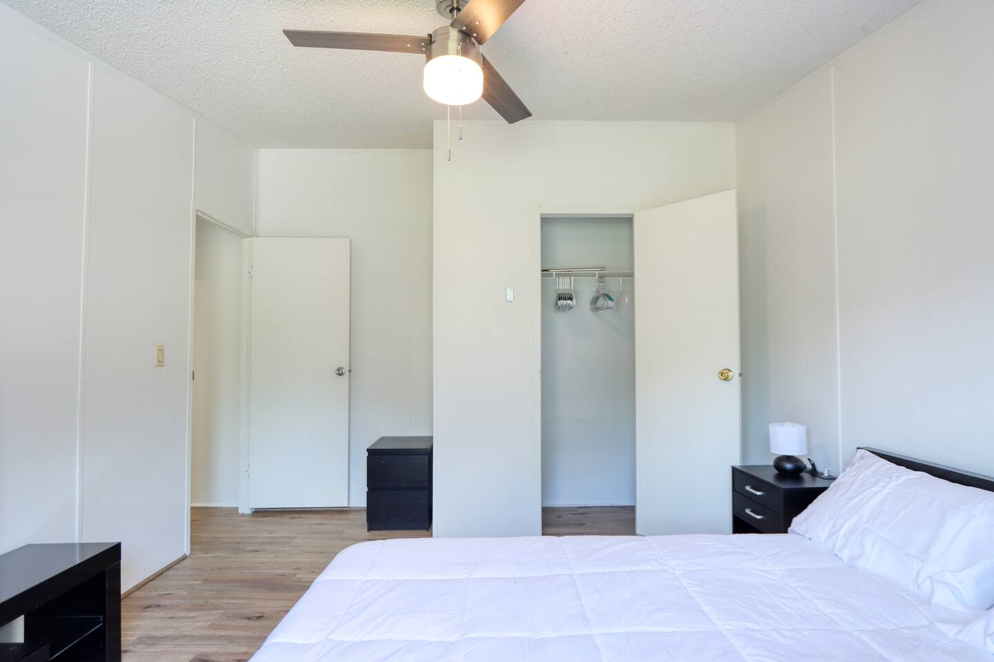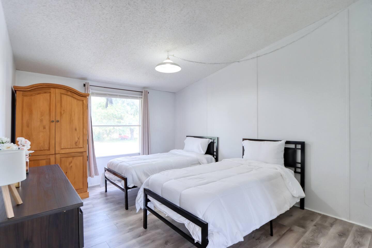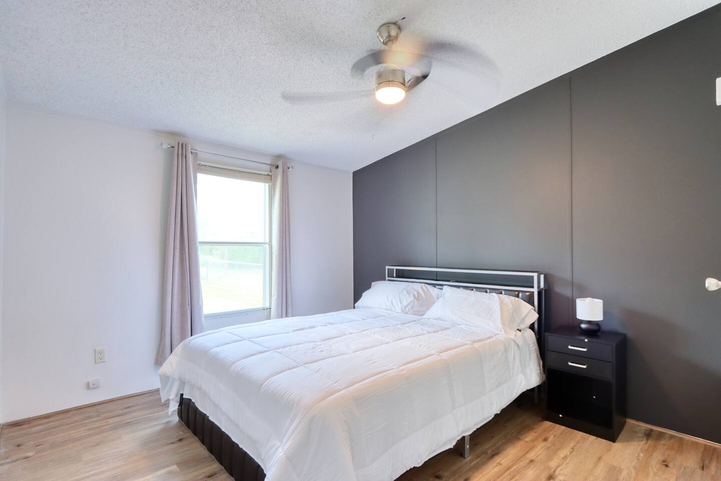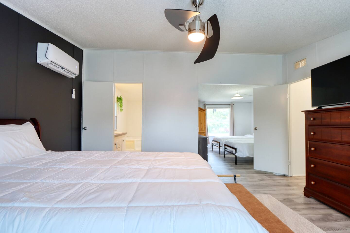 The bedroom with the 2 double beds is connected to the master bedroom. A privacy curtain is installed in between the 2 bedrooms for privacy. The 6th bed is a foldable bed for your use. The fence around the front yard is not fully fenced in. There are openings a dog of any size can fit through. Please make sure to supervise your pets.