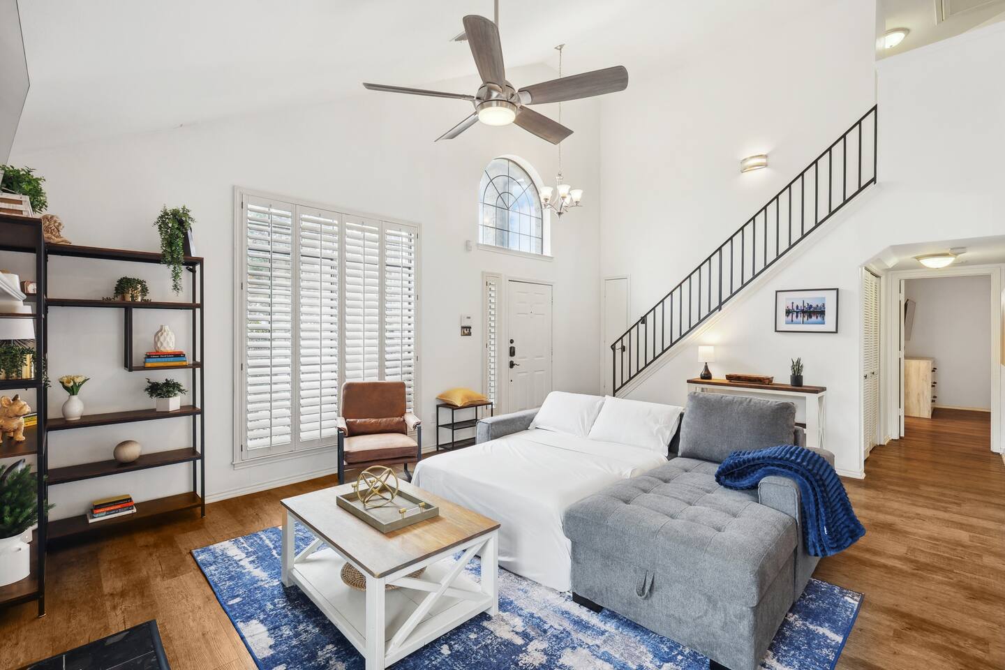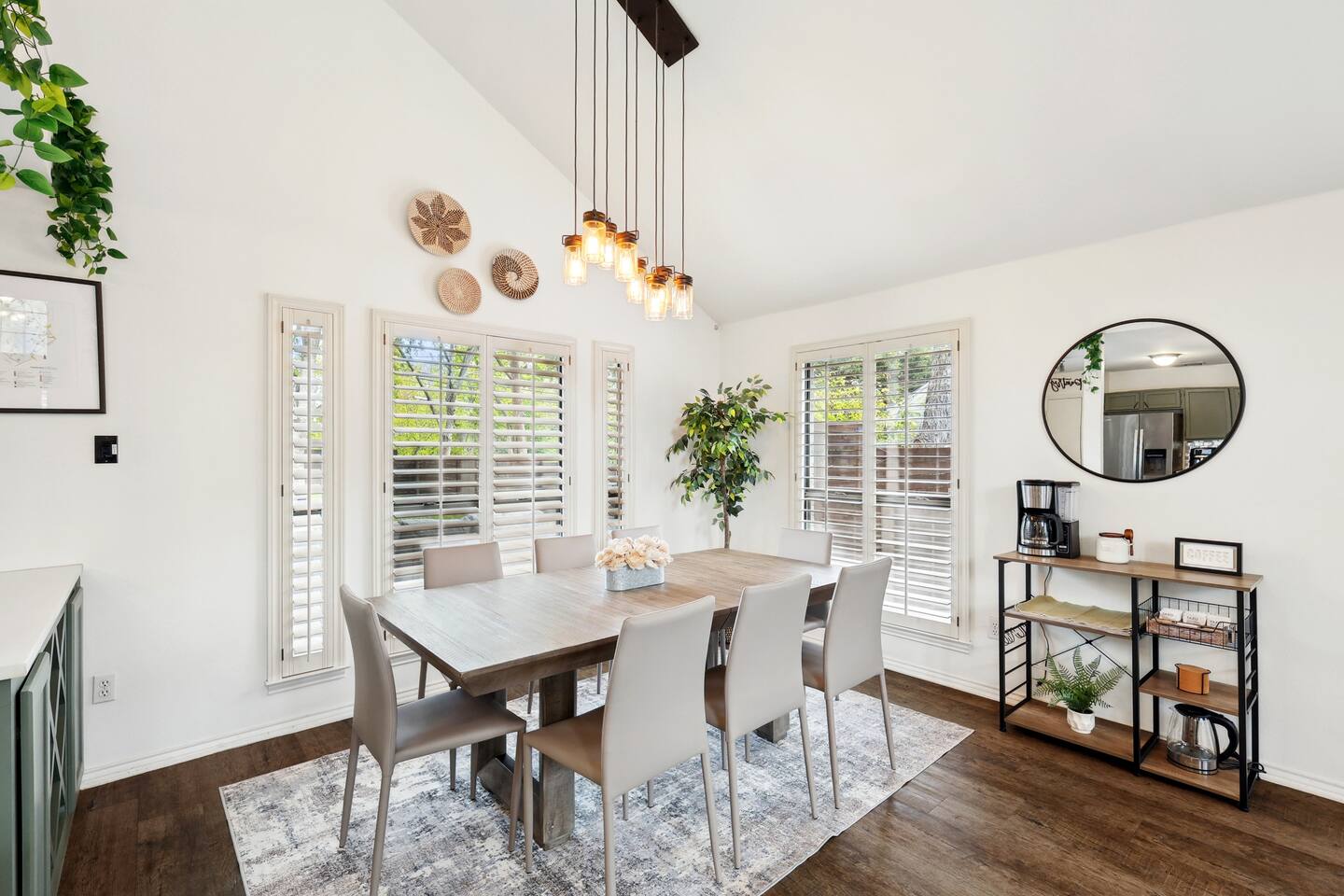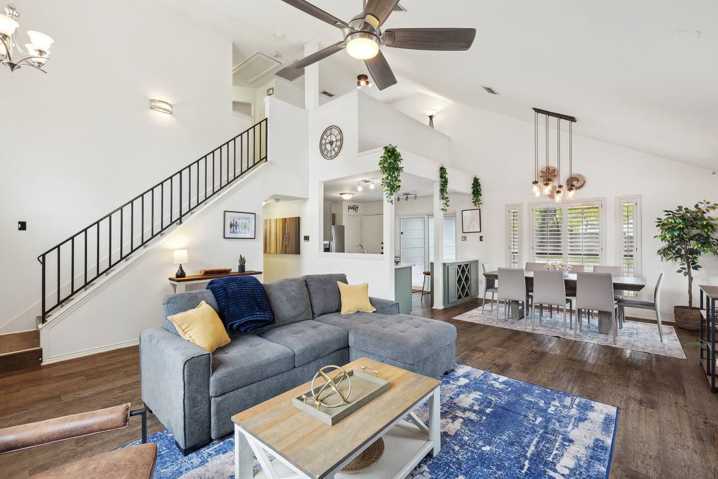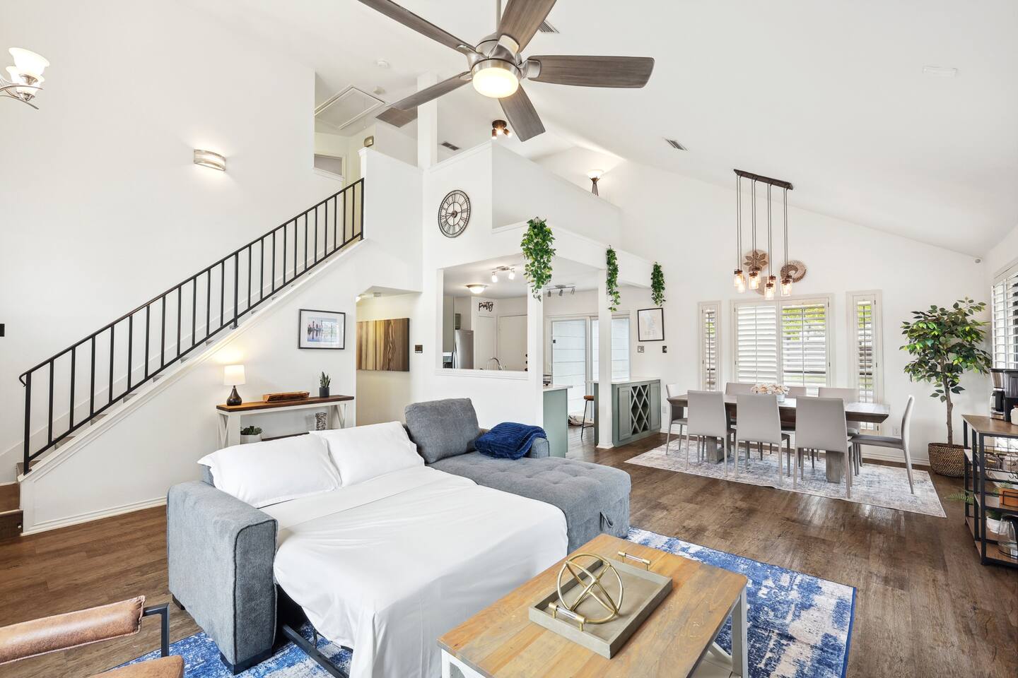 Nestled on an oversized, premium lot just minutes from White Rock Lake, this remodeled, contemporary designed home offers the perfect blend of modern elegance and comfort. Established neighborhood, mature trees, and OUTSTANDING location - minutes to the Dallas Arboretum, walking+biking trails, Lakewood, local shops & dining. Inside, abundant natural light floods the open floorplan through large windows with plantation shutters, highlighting the 20' vaulted ceiling, custom wrought iron staircase, and wood floors. The well-appointed kitchen features custom cabinetry, white quartz countertops, a stainless steel backsplash & appliances, a custom breakfast nook, and a dry bar. Additional upgrades include flooring, fresh neutral paint, & updated designer lighting. Retreat to the privacy of the master bedroom with en-suite bath & walk-in closet. Step out onto a large, shaded deck to an expansive, fully-fenced backyard, perfect for entertaining! Zoned to the award-winning Hexter Elementary. Master bedroom is equipped with a comfortable King bed and has an updated master bath. Master is located on first floor. Equipped with 55" smart TV 2nd floor consists of an office with a sleeper couch as well as the other 2 bedrooms. One bedroom has a queen bed and the other has a twin over twin bunked and a separate full bed, both rooms equipped with smart TVs The living room has high ceilings and a smart 60" TV as well as a large sleeper sofa. Full kitchen with all the essentials. Dining room for up to 8.